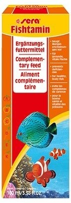 sera фиштамин – пищевая добавка, в виде эмульсии, бережно произведенной из мультивитаминного концентрата предназначена для всех видов пресноводных и морских рыб.