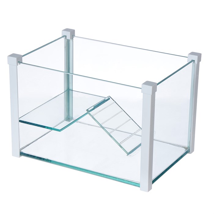 Черепашатник изготовлен из высококачественного стекла и оснащен четырьмя пластиковыми стойками. Все черепашатники продаются с платформой для купания и пандусом для подъема. Высота платформы для купания составляет 5 см, ширина - 8 см, длина - 14 см, ширина подъемного пандуса - 6 см. На подъемном пандусе есть нескользящая полоска, которая помогает черепахам карабкаться. Новый стеклянный аквариум для черепах подходит для всех видов водных и полуводных черепах и может обеспечить комфортные условия жизни для ваших питомцев. Размер 22х15х14,5 см.