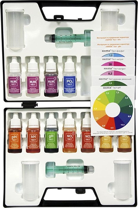 НИЛПА - набор тестов в чемоданчике - pH, kH, gH, NH3/NH4, NO2, NO3, PO4, CO2 (таблица)